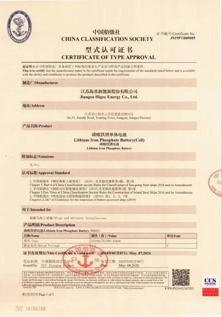2020年5月,海基新能源磷酸鐵鋰電池產(chǎn)品通過中國船級社(CCS)最新檢測指南《GD22-2019 純電池動力船舶檢驗指南》認可和檢驗,該標準發(fā)布日期為2019年12月1日,相對舊標準《GD22-2015 純電池動力船舶檢驗指南》測試內(nèi)容有顛覆性變更,增加了GB36276-2018《電子儲能用鋰離子電池》內(nèi)容。自新標準變更實施以來,我司為首批獲得此認可證書的企業(yè)。
