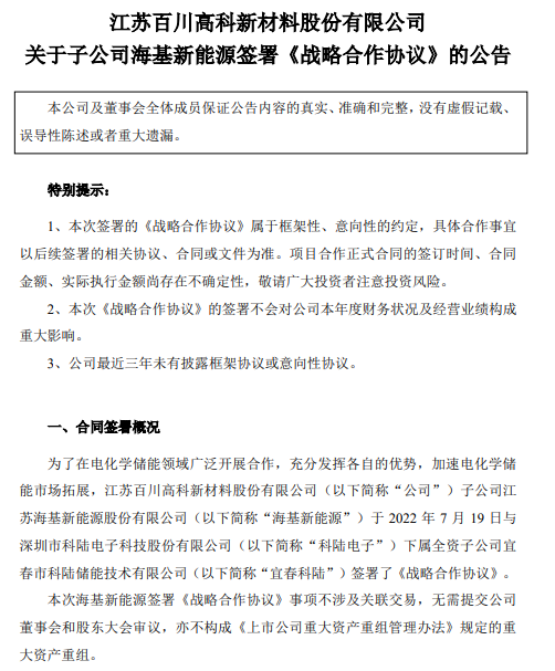 7月19日,科陸儲能宜春基地一期正式投產(chǎn)、二期簽約儀式在江西省宜春市經(jīng)濟技術(shù)開發(fā)區(qū)隆重舉行。現(xiàn)場,宜春科陸儲能與海基新能源簽訂戰(zhàn)略合作協(xié)議。根據(jù)協(xié)議,雙方將基于戰(zhàn)略發(fā)展需要,結(jié)合雙方優(yōu)勢,深入開展供應(yīng)鏈合作、儲能產(chǎn)業(yè)化合作。海基新能源負責提供280Ah鋰離子電池單體,總?cè)萘繛?GWh,協(xié)助滿足項目需求的儲能系統(tǒng)整體方案制定。